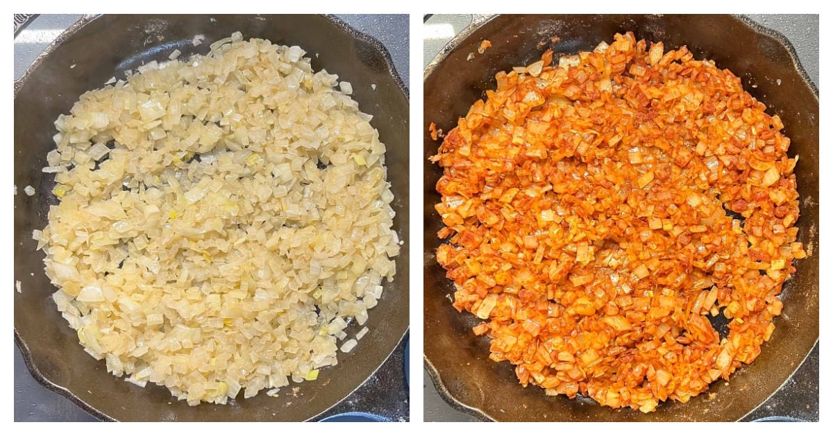 - Turn temperature down to medium and add chopped onions. Cook, stirring occasionally, just until soft. Stir in paprika.