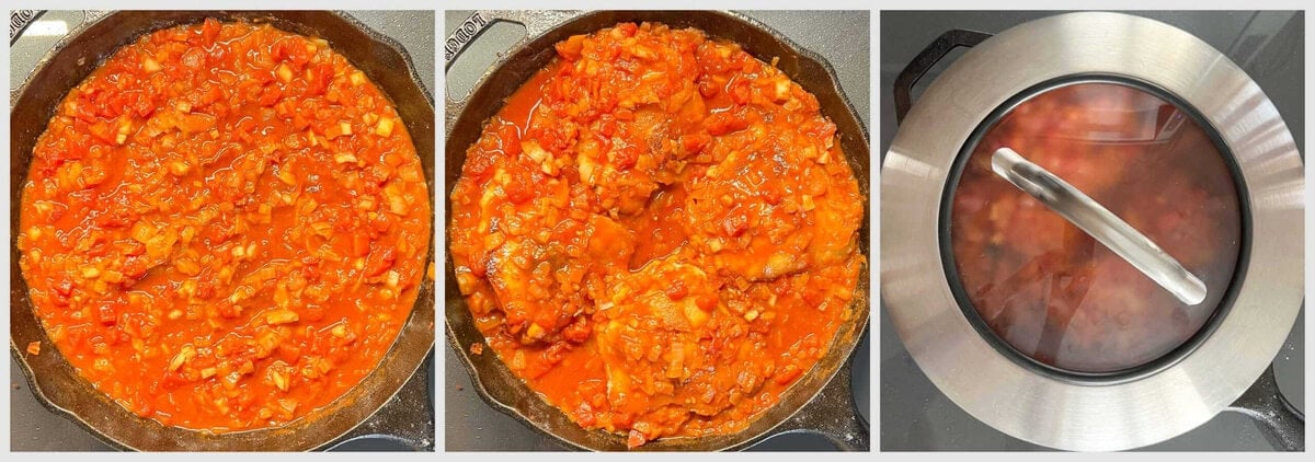 - Place chicken broth in a 1 cup measuring cup. Add reserved tomato juice to make 1 cup liquid. Stir into onion mixture. Add diced tomatoes, yellow pepper and salt. Nestle chicken pieces in sauce. Cover pan and cook on low heat until chicken is very tender cooked through (165 degrees on an instant read thermometer), around 45 minutes.