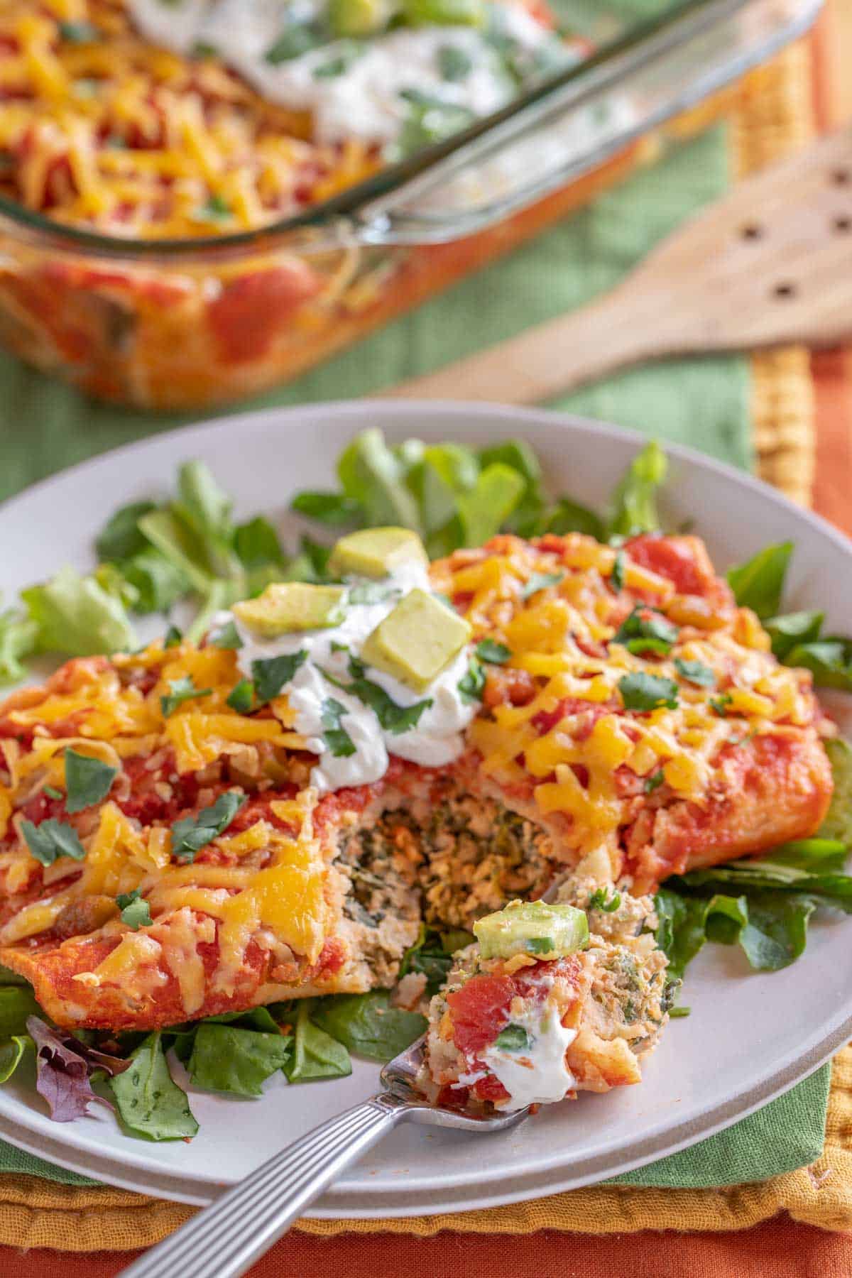 - Place 1/2 cup lettuce on each dinner plate, top with two enchiladas. Garnish with a spoonful of sour cream, sprinkle of chopped cilantro and/or chopped avocado.