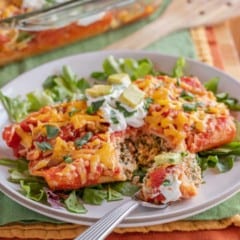 My mom was the queen of “quick and easy” recipes, and these turkey enchiladas don’t disappoint. Using prepared salsa and chopped tomatoes for the red sauce definitely speeds up the process! Plus, serving the enchiladas atop chopped lettuce makes this a one dish meal.