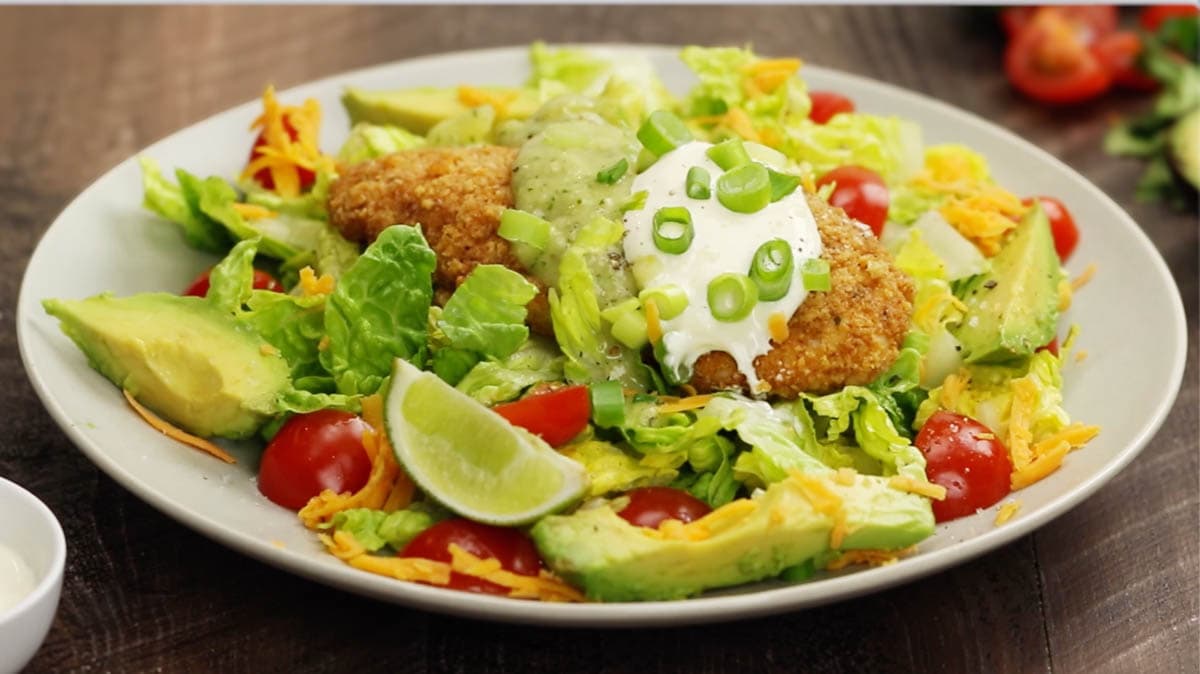 Instead of just dipping chicken pieces in beaten egg and then dredging in plain breadcrumbs, I add salsa to the eggs, and chili powder, cumin, garlic salt, and oregano to the breadcrumbs. The baked crispy chicken is then served on a bed of torn lettuce, accompanied by grape tomatoes, avocado slices, tomatillo-green chile salsa (also known as salsa verde), sour cream, and shredded Cheddar cheese. The result is a super easy recipe that will please the whole family!