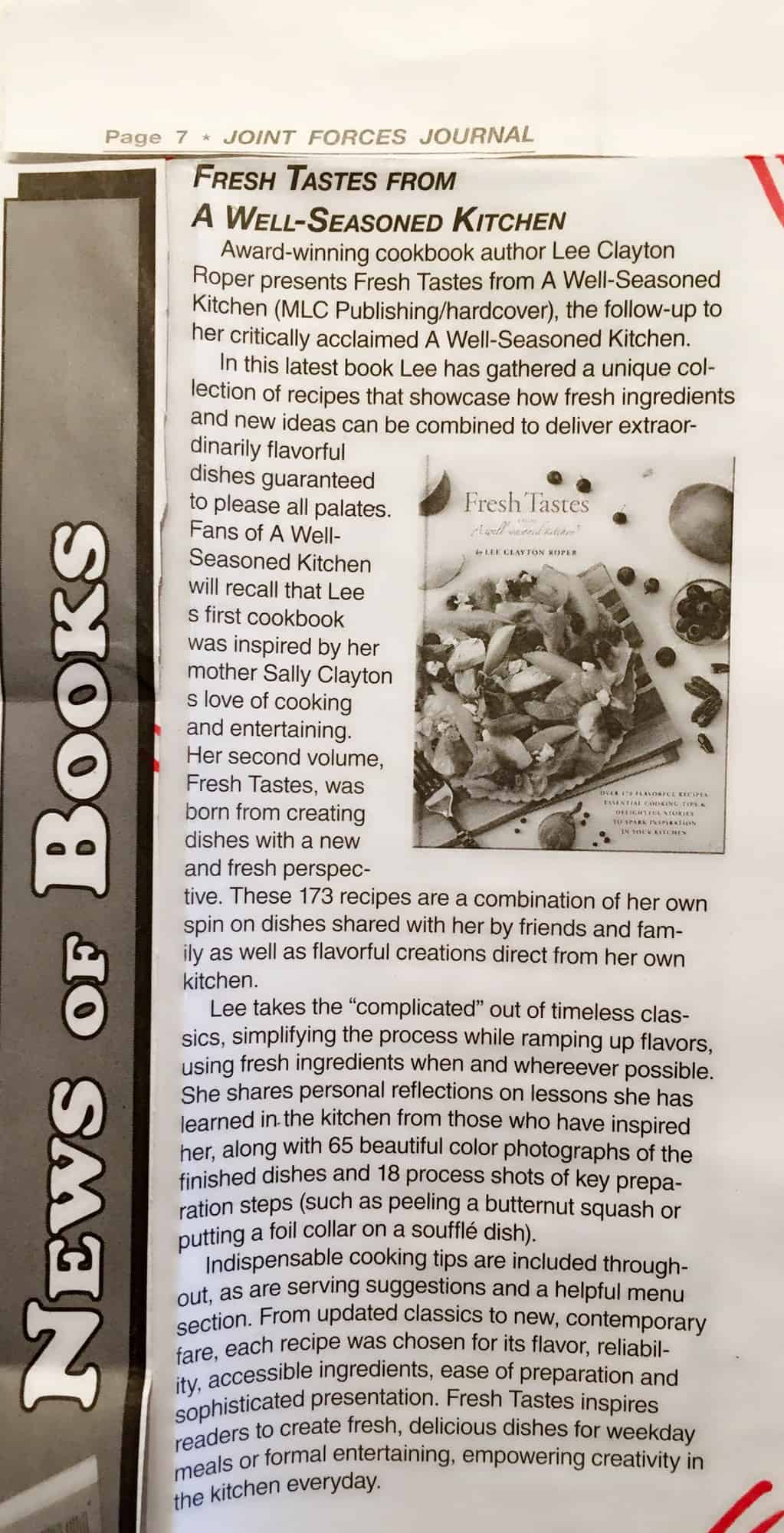 Review of Fresh Tastes: “Roper’s follow-up to A Well-Seasoned Kitchen expands on the approachable favorites that made her first effort such a hit, this time with a “fresh” take on classics that lend themselves to parties and get-togethers. . . Roper’s fans will love it. This is a solid effort with practical dishes readers will likely find themselves returning to.”