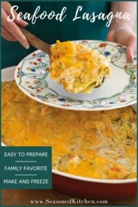 I love crab and shrimp, especially when paired with a cheese sauce. So, a seafood lasagna seemed like a great idea to me and mom when we were talking about what kind of unusual lasagna recipe we wanted to include in our cookbook A Well-Seasoned Kitchen®. However, it took me months to find the right mixture of ingredients. Sometimes it was too cheesy, or too creamy, or didn’t have enough seafood – or too much and tasted fishy. In this Seafood Lasagna we finally found the perfect balance of flavors. Yay!