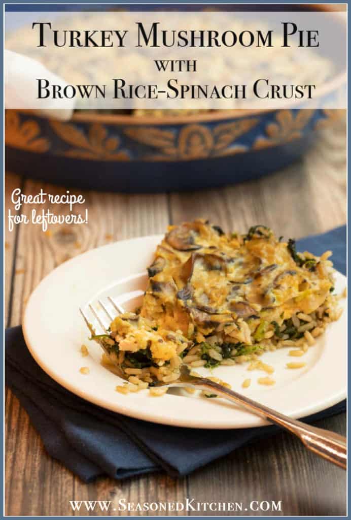 - Spread chopped turkey evenly over cooled spinach-rice crust. Top with grated cheese and chopped onion. Spread mushroom sauce evenly over the top and bake for 30 to 40 minutes or until pie is hot and bubbly.