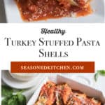 - Spoon about 3 tablespoons of turkey mixture into 12 pasta shells and arrange, filled side up, over sauce in prepared dish. Spoon remaining 1 cup marinara sauce around and over the top of the stuffed shells. Bake, covered, for 30 to 40 minutes or until hot. Sprinkle with Parmesan cheese before serving.